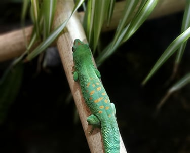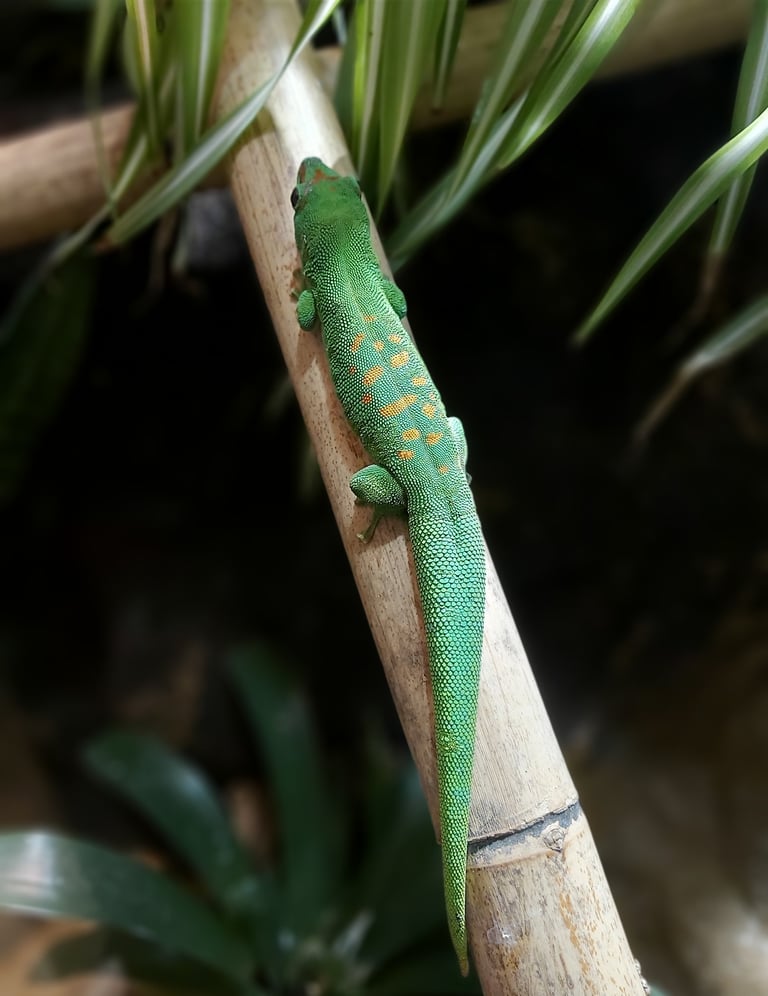 Phelsuma grandis ernährt sich hauptsächlich karnivor, d.h. von Insekten. Ich füttere meinen Tieren alles was der Markt zu bieten hat und was ins Maul passt. Von Heuschrecken, Heimchen, Grillen, Terfly, Wachsmottenlarven, Mehlwürmer bis hin zu Fruchtbrei wie etwa zerdrückte Banane oder püriere Papaya oder Mango. Die Breie gibt es maximal alle 2 Wochen und diese werden regelmäßig mit einem Vitaminpräparat wie Korvimin ZVT+Reptil angereichert. In der Zuchtperiode reiche ich zusätzlich ein Schälchen mit zerstoßener Sepiaschale und ein Schälchen mit Blütenpollen, was vor allem von den Weibchen sehr gerne angenommen wird.